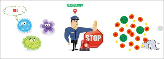 微生物通過(guò)離子運(yùn)輸營(yíng)養(yǎng)維持生長(zhǎng)繁殖,吡啶硫酮通過(guò)破壞微生物的該運(yùn)輸方式,讓營(yíng)養(yǎng)運(yùn)輸不進(jìn)去,使得細(xì)菌最終被“餓死”。同時(shí),鋅離子本身也具有一定的抑菌能力。因此,吡啶硫酮鋅在殺菌的同時(shí),本身并未被消耗,可反復(fù)殺菌,具有高效、長(zhǎng)效的殺菌能力。
